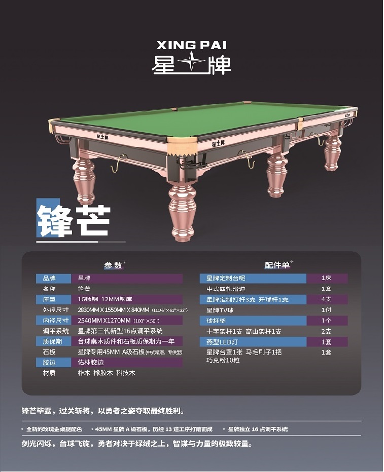 星牌中式台球桌锋芒,中式钢库球台,颜色及用料考究,结构科学,自带水平调节器。